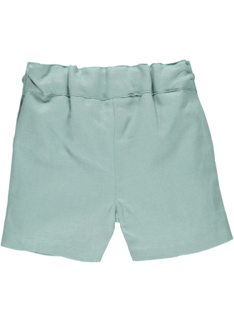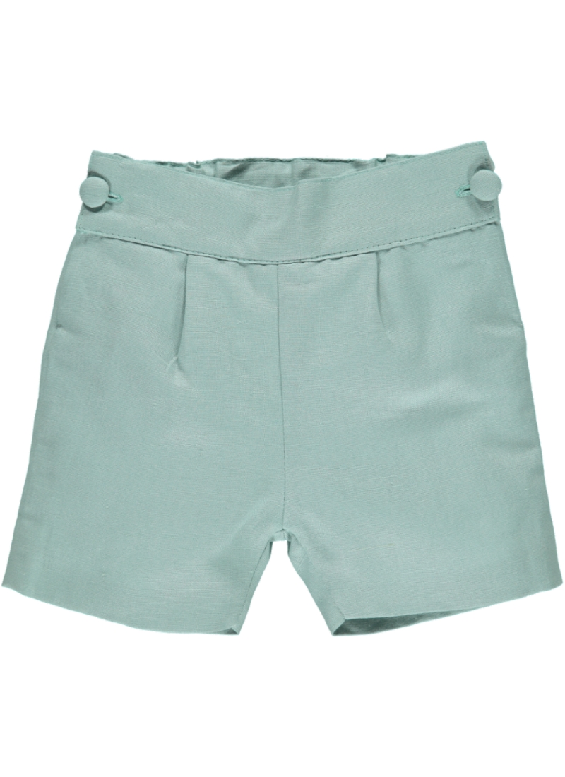 • Calções de tecido azul claro com botões e pregas.