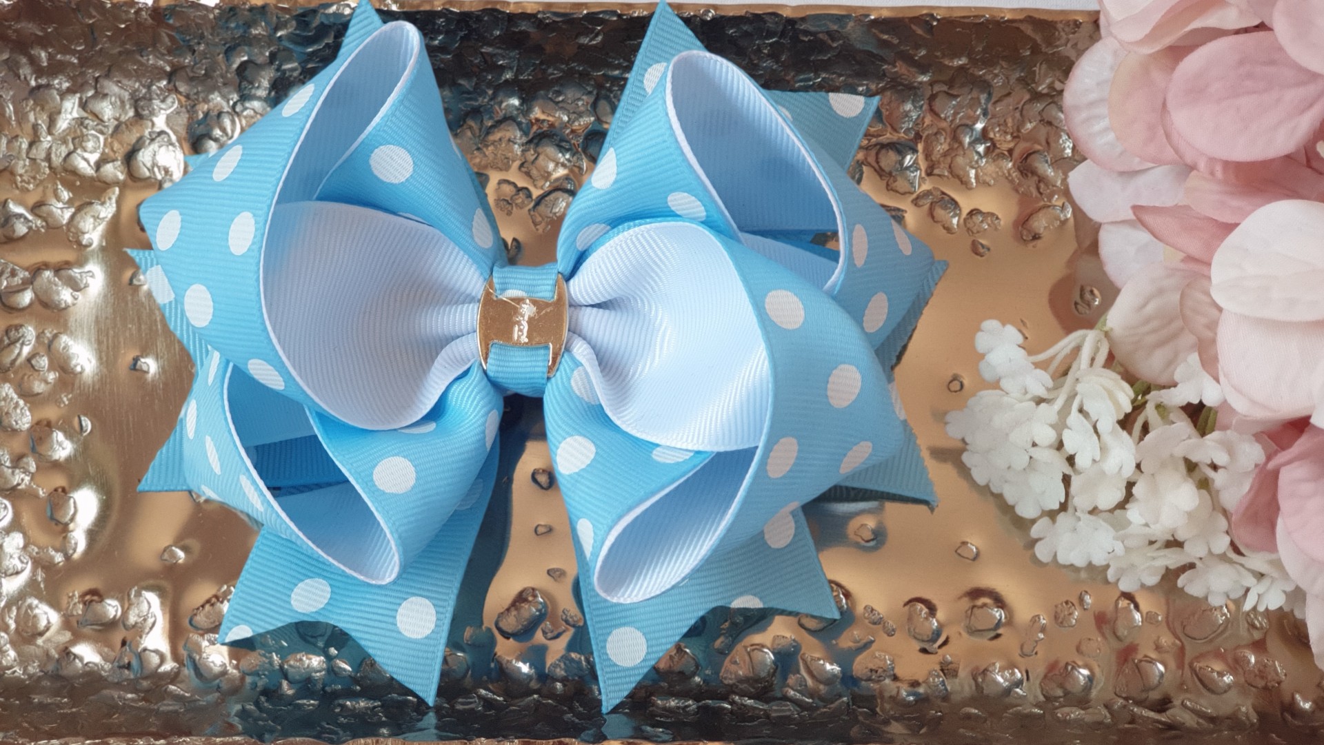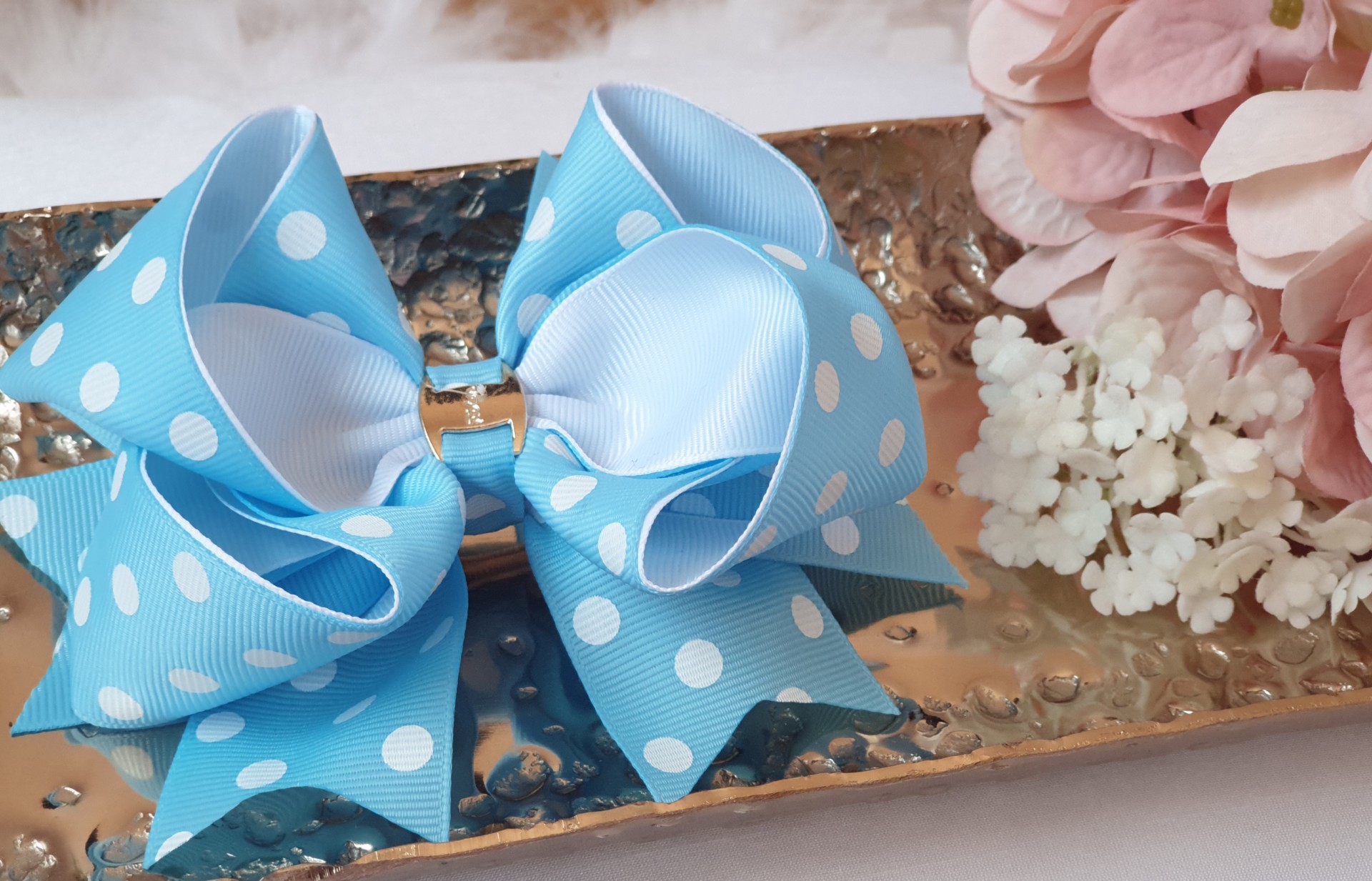 LIGHT BLUE GOLD HAIR BOW 10,25 € Desconto de %. IVA incluído. Partilhar HAIR BOW HAIR BOW Comprar Contactar Grosgrain Clip Bow COLOUR - LIGHT BLUE WITH DOTS and white Dimension - 12cmx9cm